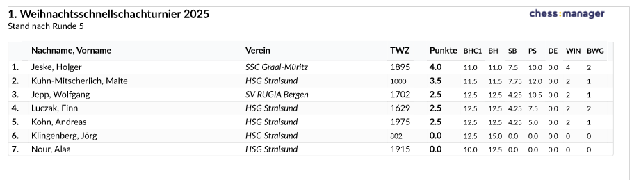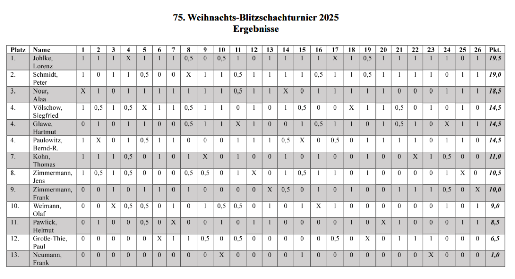 Das 75. Weihnachts-Blitzschachturnier gewann Lorenz Johlke aus unserem stralsunder Verein mit 0,5 Punkten Vorsprung auf Platz 2 und insgesamt 19,5/24 Punkten.